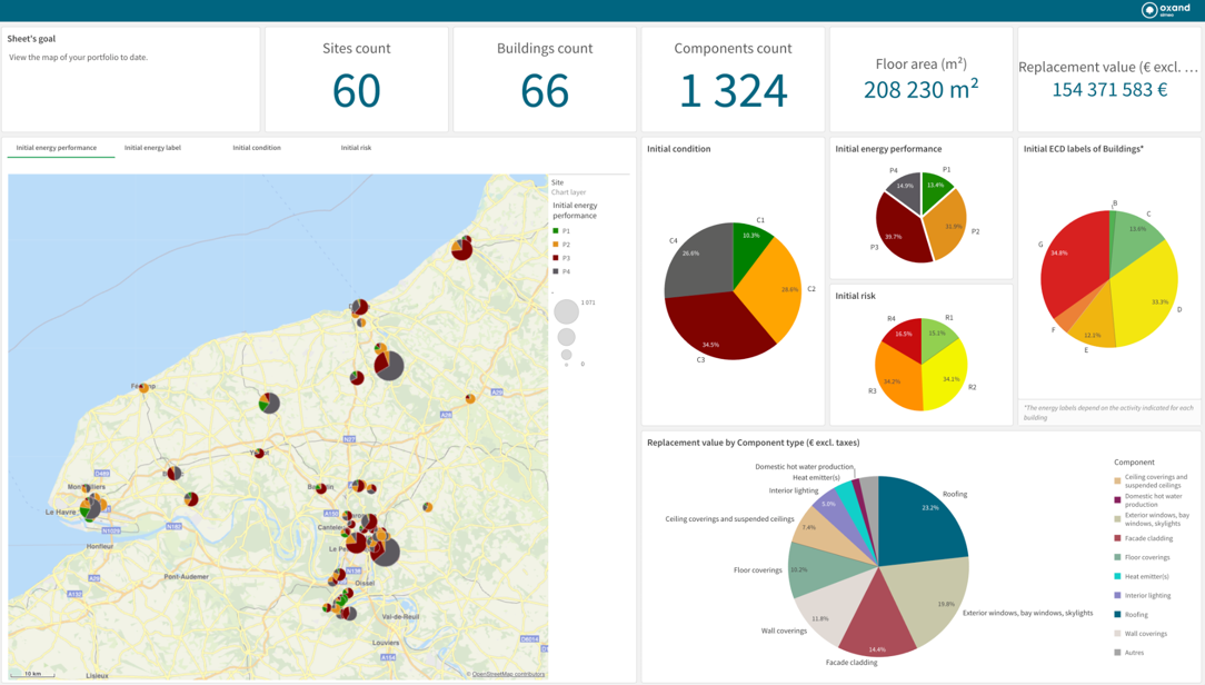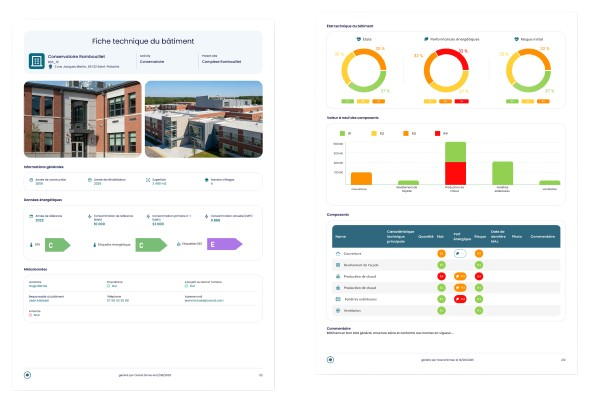 Genereer eenvoudige, visuele informatiebladen Samenvatting van de toestand, risico's, energieprestaties en investeringsbehoeften.